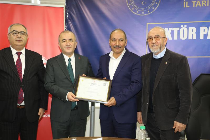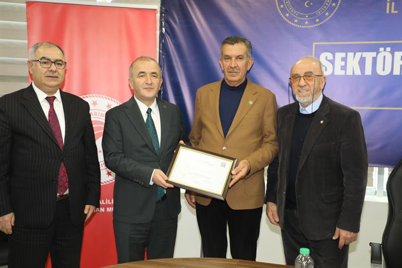 Ayrıca toplantı kapsamında, Tarım ve Orman Bakanlığımız tarafından 2026 yılı Birinci Derece Tarımsal Örgüt Belgesi almaya hak kazanan; Elazığ İli Damızlık Koyun Keçi Yetiştiricileri Birliği, Elazığ İli Süt Üreticileri Birliği, S.S. Elazığ Pancar Ekicileri Kooperatifi ve Elazığ İç Suları Yetiştiricileri Üretici Birliği'ne belgeleri, Elazığ Valimiz Sayın Numan Hatipoğlu tarafından takdim edildi.