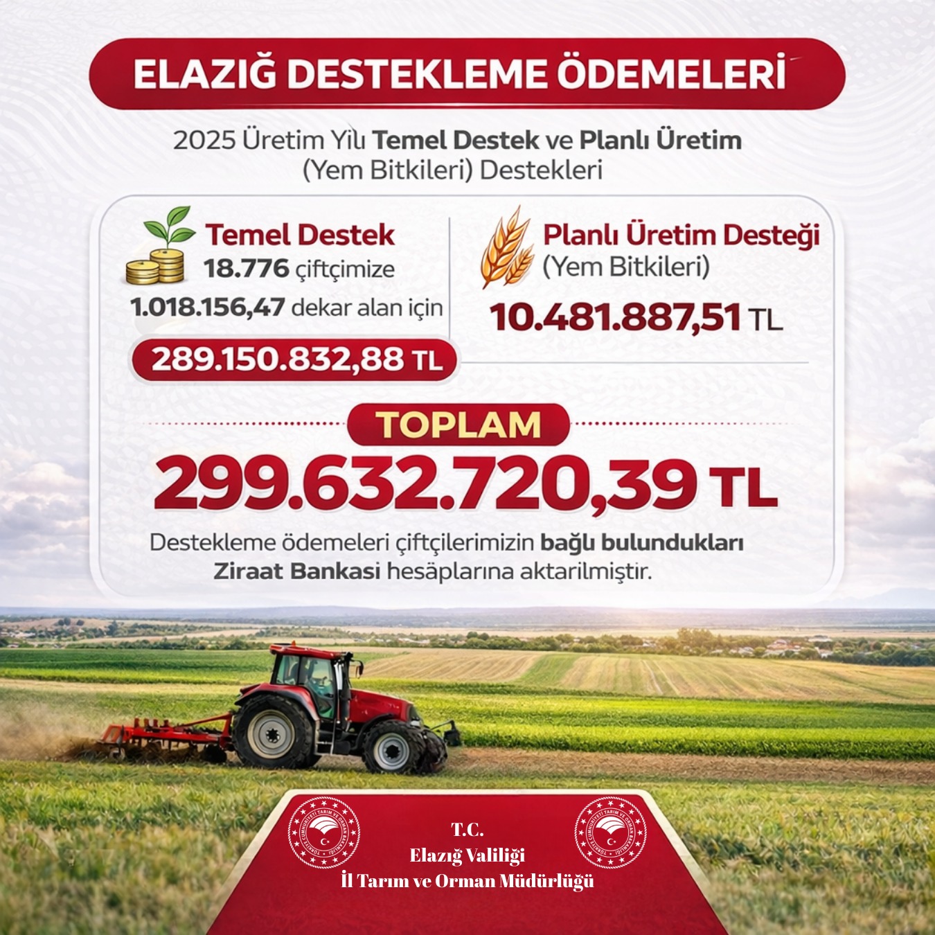 10.481.887,51 TL Planlı Üretim (Yem Bitkileri) Desteği olmak üzere toplam 299.632.720,39 TL destekleme ödemesi çiftçilerimizin bağlı bulundukları Ziraat Bankası şubelerindeki hesaplarına aktarılmış ve ödemelere başlanmıştır.