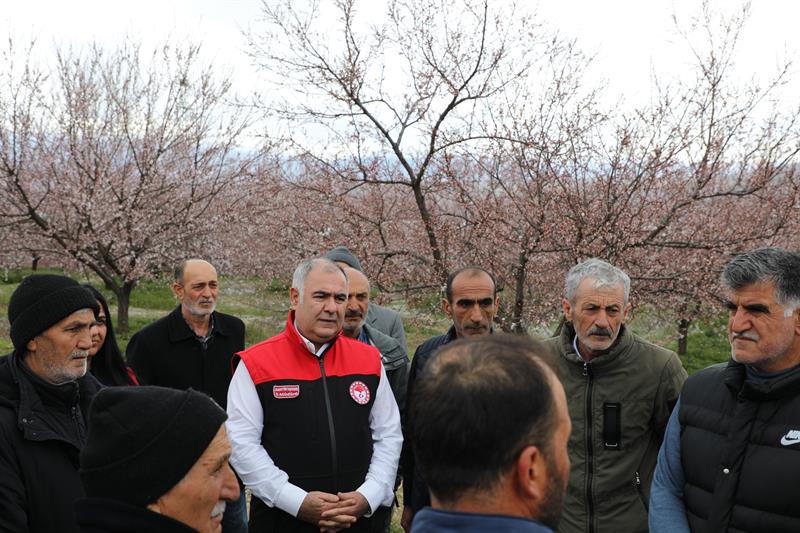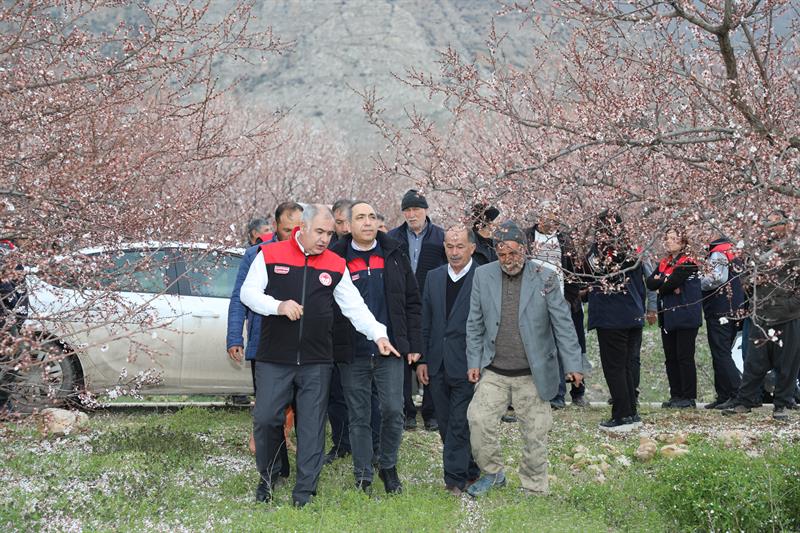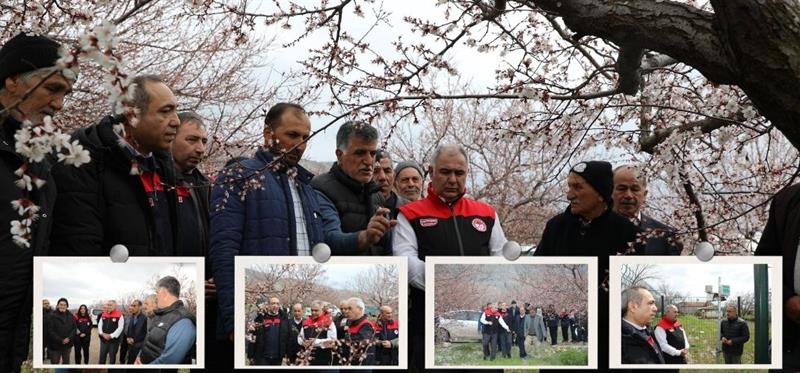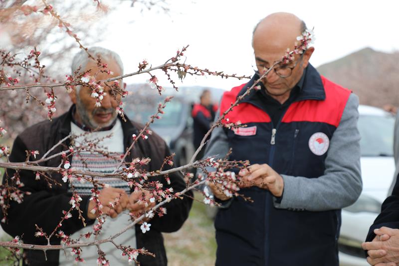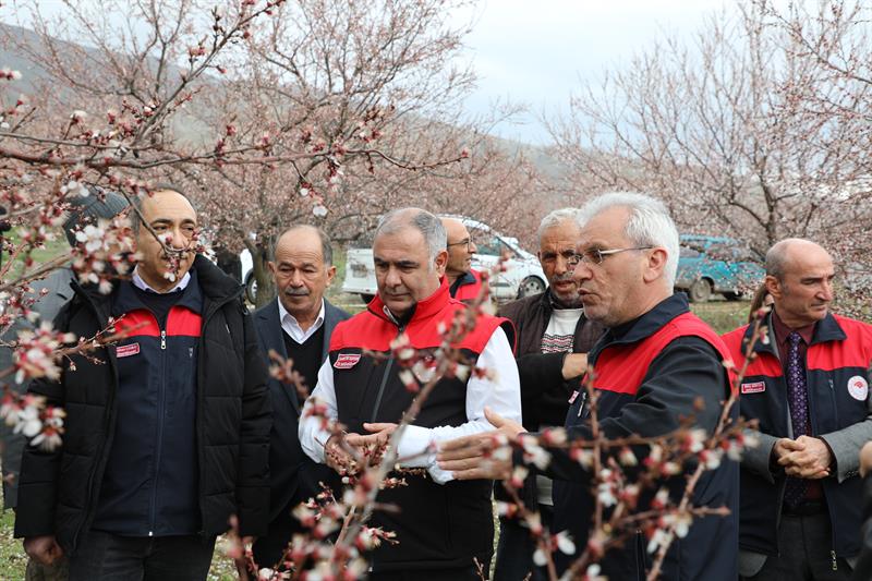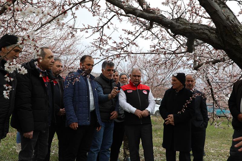Çiçeklenme dönemine ulaşan kayısı ağaçlarıyla birlikte geniş alanlara yayılan beyaz örtü, üretim sezonunun başlangıcını sahada belirgin biçimde yansıtırken; bu süreçte gerçekleştirilen incelemelerde üreticilerin de katılımıyla hastalık ve zararlılara yönelik kontroller yapıldı, üretimin sağlıklı ilerlemesine ilişkin değerlendirmelerde bulunuldu.