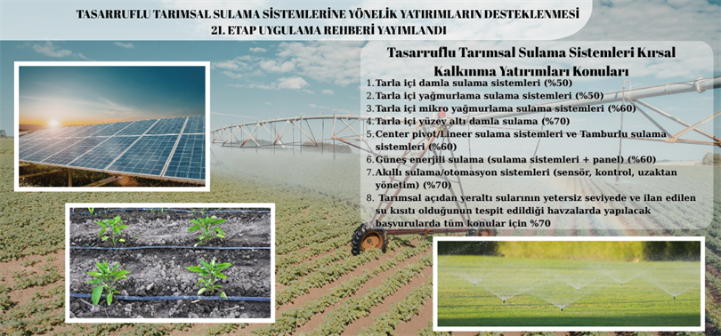 Tarım ve Orman Bakanlığı tarafından yayımlanan “Kırsal Kalkınma Yatırım Programı Kapsamında Tasarruflu Tarımsal Sulama Sistemlerine Yönelik Yatırımların Desteklenmesi Hakkında Tebliğ (Tebliğ No: 2026/10)" ve 21. Etap Uygulama Rehberi ile tarımsal sulamada verimlilik, sürdürülebilirlik ve teknoloji kullanımında yeni bir dönem başlatılmıştır.